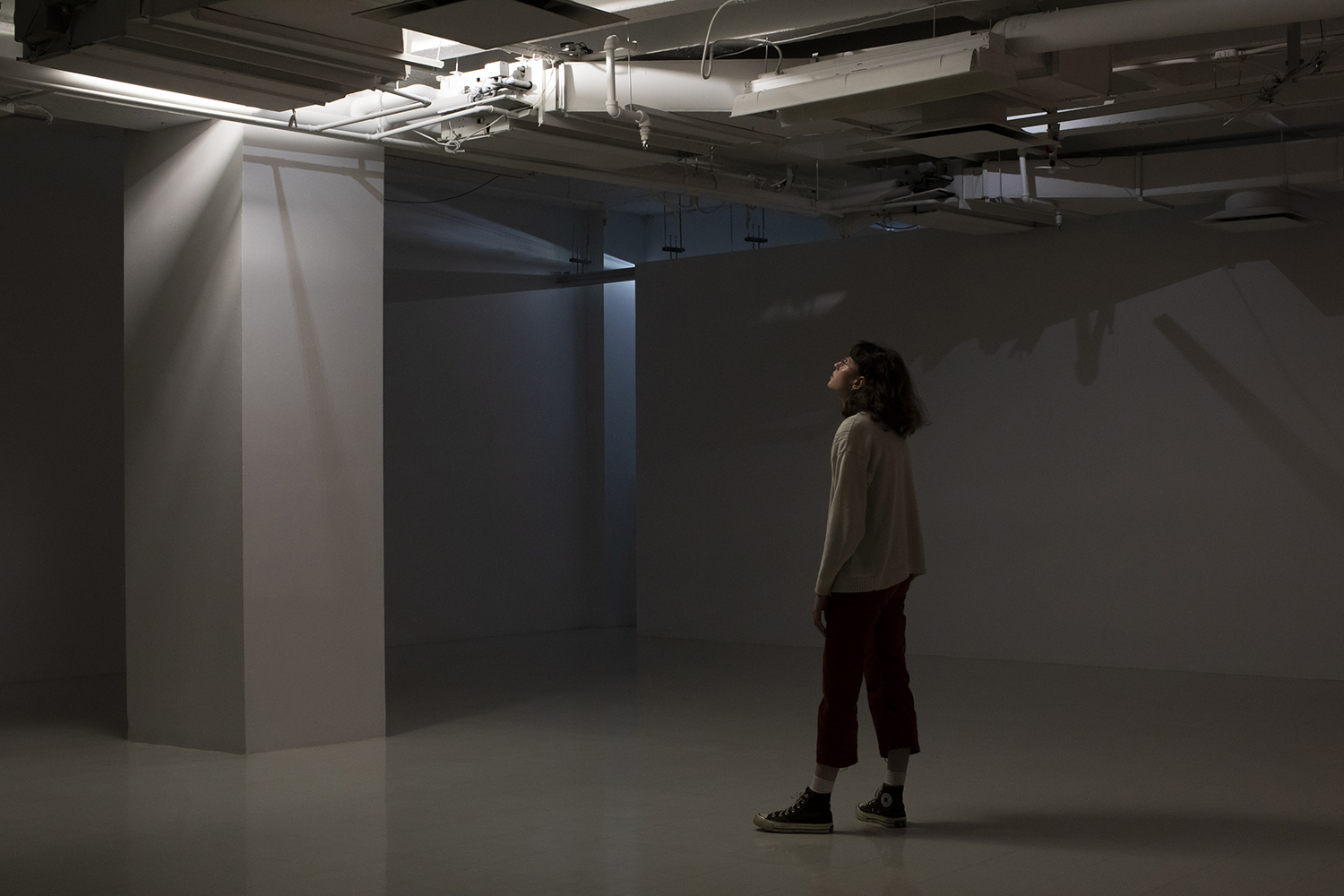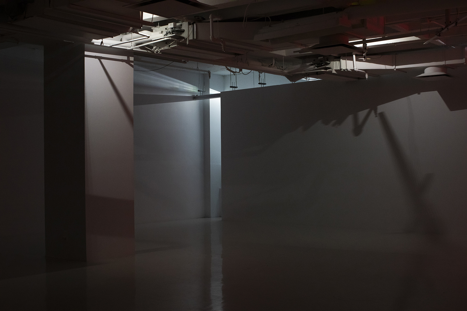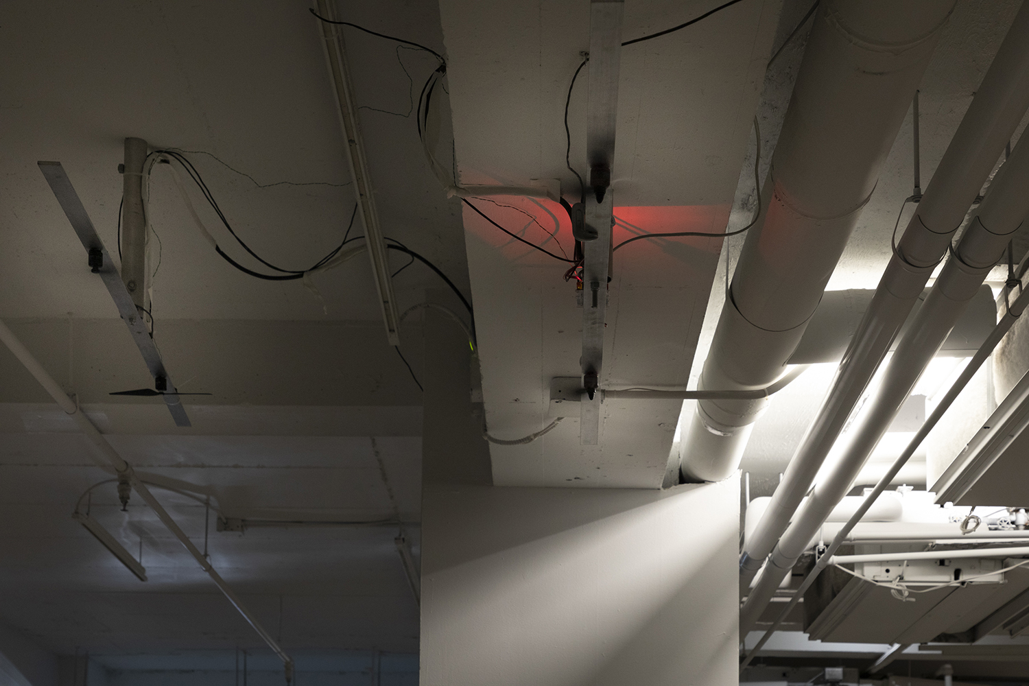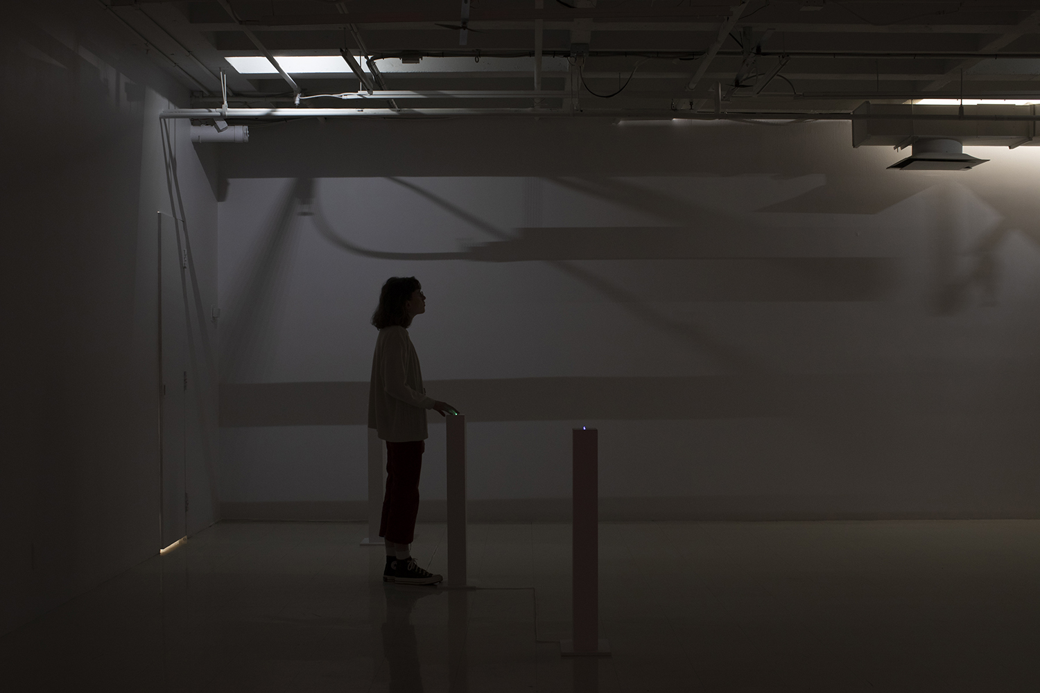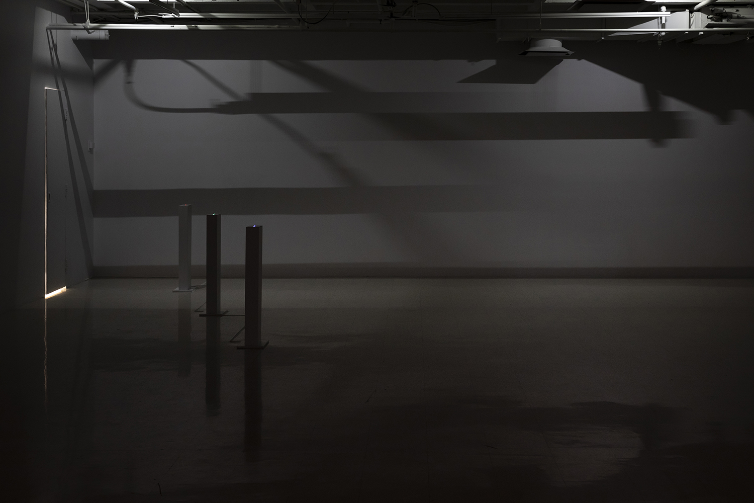 Le dispositif interprète les qualités acoustiques de la galerie et active une résonance complexe et multivoque. Dans cet environnement de strates sonores et de modulations lumineuses se dessinent des trajectoires à la fois contiguës et furtives offrant la sensation de multiples déplacements dans l’espace.